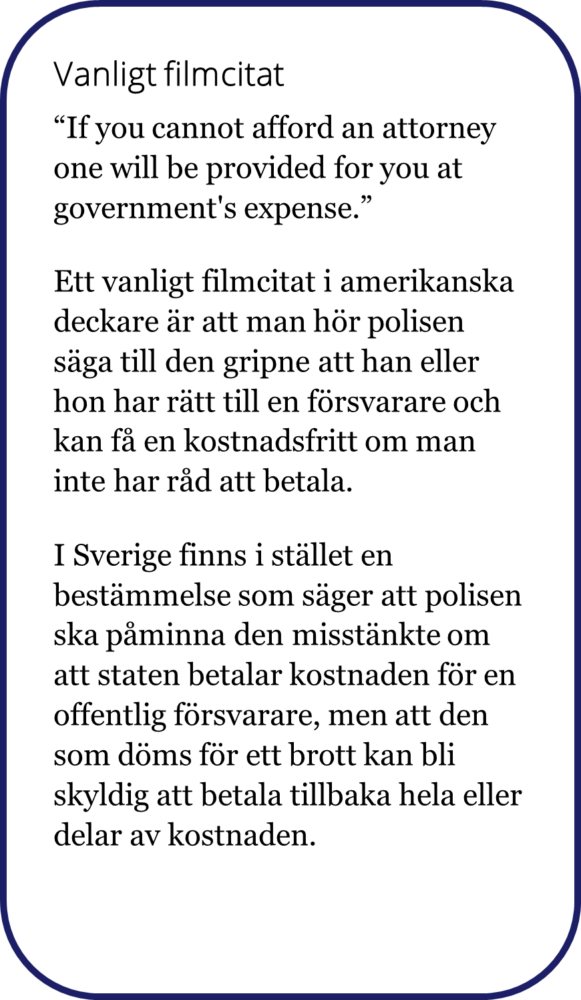Det är domstolen som utser en offentlig försvarare för den som är misstänkt eller åtalad för ett brott. Det betyder att det är staten som betalar ersättningen direkt till försvararen, trots att försvararen jobbar för den som är misstänkt eller är åtalad. Den som är misstänkt eller åtalad behöver alltså inte ligga ute med några pengar eller betala något förskott. Den som blir dömd för ett brott kan bli skyldig att betala advokatkostnaden. Först när domen inte längre kan överklagas blir man skyldig att betala advokatkostnaderna. Från den tidpunkten har man 30 dagar på sig att betala. Det går normalt inte att begära mer tid för att betala eller att få en avbetalningsplan.