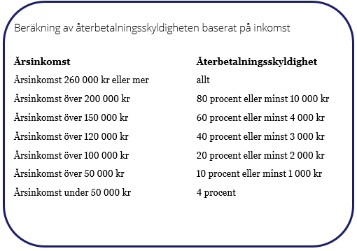 Återbetalningsskyldigheten beräknas utifrån din ekonomi och familjesituation. Den som tjänar mer än 260 000 kr per år, det vill säga knappt 22 000 kr per månad behöver normalt betala tillbaka hela kostnaden. Hänsyn tas till om du har barn som du är försörjningsskyldig för, det vill säga normalt barn under 18 år. Om du tjänar under gränsen kan du bli skyldig att betala en del av kostnaderna.