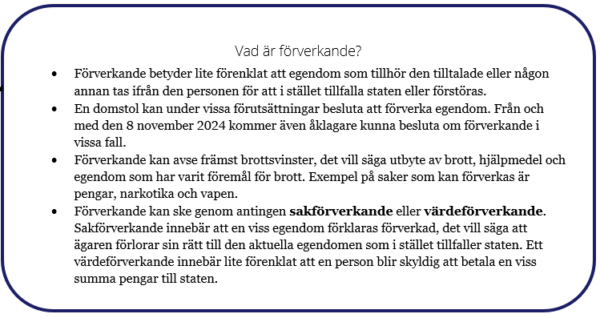 Den nya lagstiftningen om förverkande börjar gälla den 8 november. Det återstår att se vilket genomslag de nya reglerna kommer att få och vilka frågor som eventuellt kan dyka upp i rättstillämpningen med anledning av de nya reglerna. Alla förändringar och överväganden som ligger bakom lagändringarna framgår av propositionen En ny förverkandelagstiftning 2023/24:144, som du kan hitta här: En ny förverkandelagstiftning – Regeringen.se.