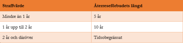 I utlänningslagen anges följande riktlinjer för hur långt återreseförbudet ska vara baserat på brottslighetens straffvärde.